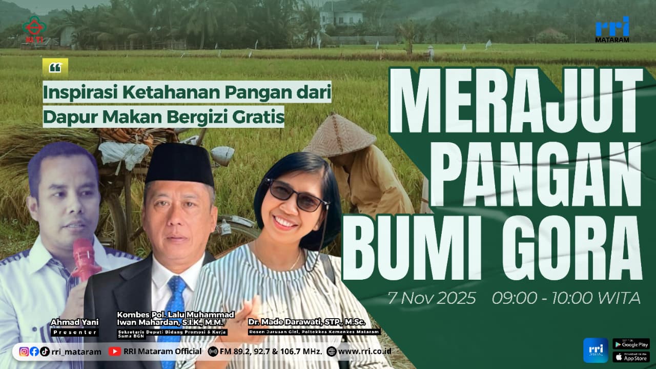 Matalensa–Mataram– Program ketahanan pangan bukan lagi sekadar jargon pemerintah. Dalam dialog interaktif Merajut Pangan Bumi Gora yang tayang di RRI Mataram, Jumat (7/11/2025), Sekretarid Deputi (Sesdep) Promosi dan Kerja Sama Badan Gizi Nasional (BGN) RI, Kombes Pol. Lalu Muhammad Iwan Mahardan, S.I.K., M.M., memaparkan bagaimana dapur makan bergizi gratis (MBG), dapat menjadi “mesin perubahan” untuk kualitas SDM Indonesia.