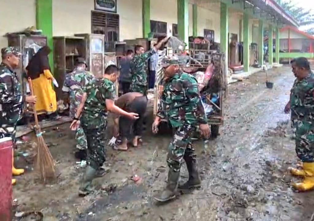 Matalensa- Aceh Utara – Personel Koramil 03/Dewantara bersama Pimpinan Dayah dan dewan guru melaksanakan aksi tanggap bencana pasca banjir di Dayah Samsul Duha, Cot Murong, Kecamatan Dewantara. Kegiatan ini difokuskan pada pemulihan fasilitas pendidikan dan asrama agar santri dapat segera kembali beraktivitas dengan normal. Minggu (28/12/2025).