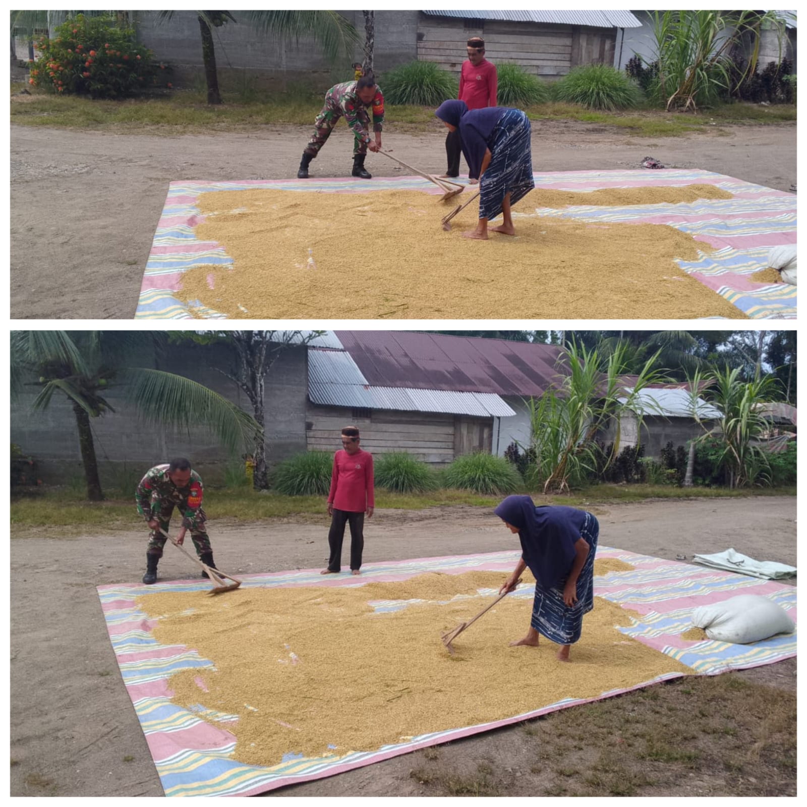 Kegiatan tersebut dilakukan bersama Bapak Abdulah di Desa Alue Perman, Kecamatan Woyla Barat, Kabupaten Aceh Barat, pada Kamis (23/4/2026). Dengan penuh semangat, Babinsa bersama warga menggelar padi yang baru dipanen untuk dijemur di bawah terik matahari agar kualitas gabah tetap terjaga sebelum masuk ke tahap pengolahan berikutnya.