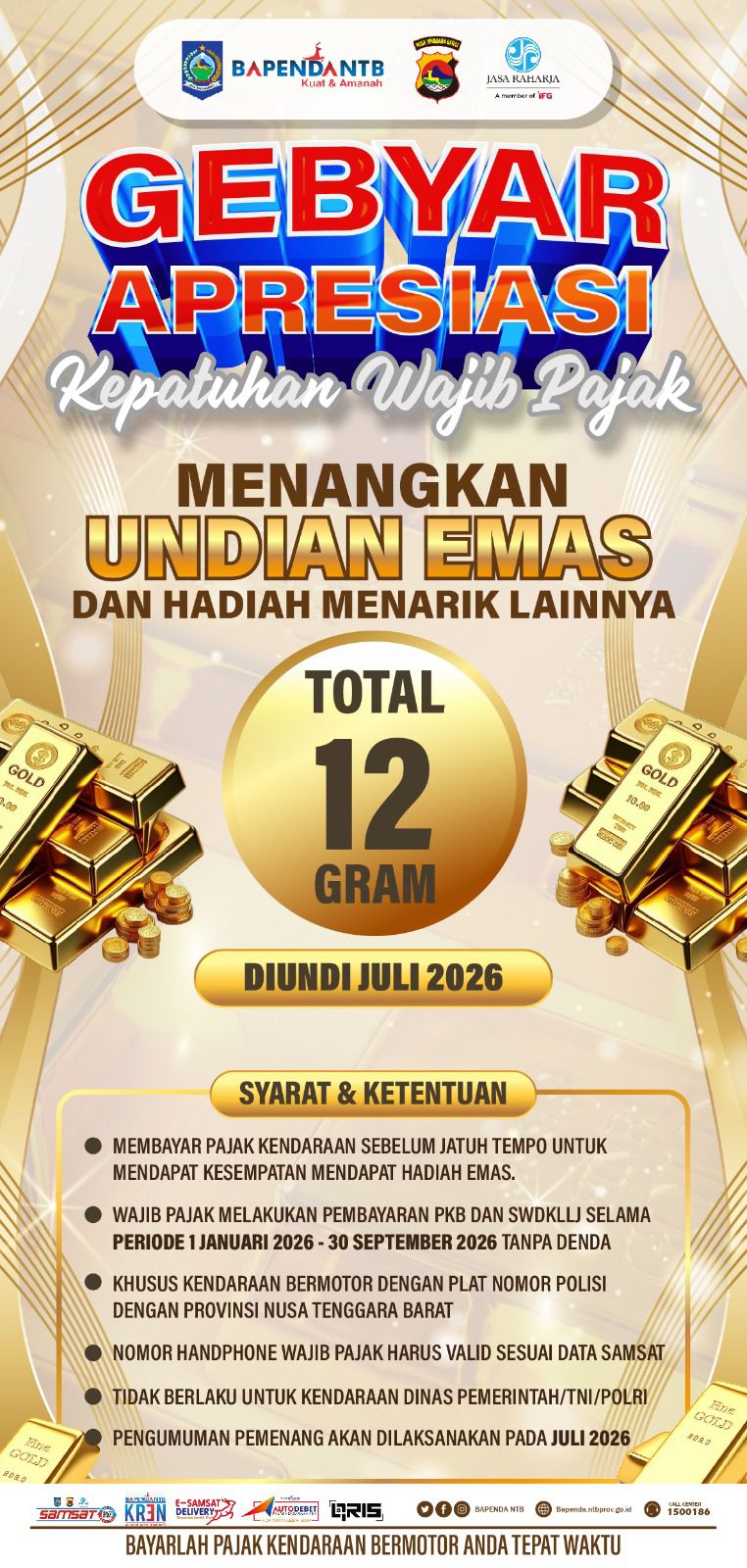 Matalensa- Mataram – Pemerintah Provinsi Nusa Tenggara Barat bekerjasama dengan Tim Pembina Samsat Provinsi Nusa Tenggara Barat menyelenggarakan Undian Emas dengan total 12 gram dan hadiah menarik lainnya.