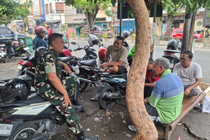 Matalensa- Surakarta, Babinsa Danukusuman Koramil 03/Serengan Kodim 0735 Surakarta Serda Tito melaksanakan Komsos dengan Bpk. Suryo di Halaman Pasar Harjodaksino Danukusuman Serengan Kota Surakarta, S...