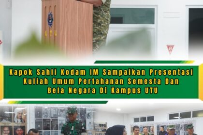 Matalensa || Aceh Barat – Kapok Sahli Kodam IM Brigjen TNI Dr. Bambang Sulistyo Hery, S.Sos., M.Han., sampaikan presentasi Kuliah Umum pertahanan semesta dan bela negara di Aula Gedung Auditoriu...