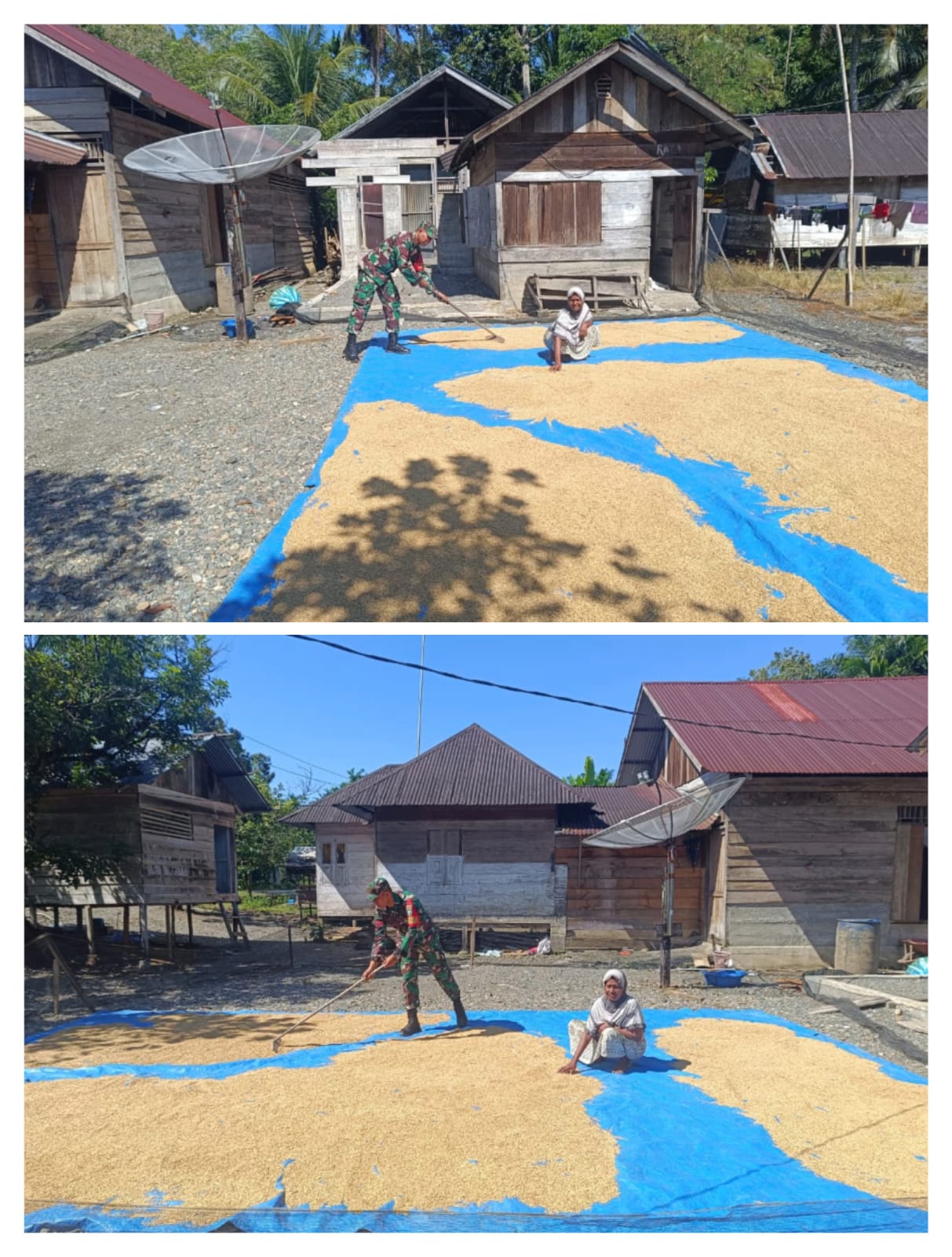Matalensa || Panton Reu – Koptu Said Saiful Azmi, Babinsa Posramil 12/Panton Reu Kodim 0105/Abar, melaksanakan kegiatan pendampingan kepada warga binaan dengan membantu menjemur padi di Gampong Manggie.Senin,20/04/2026.
