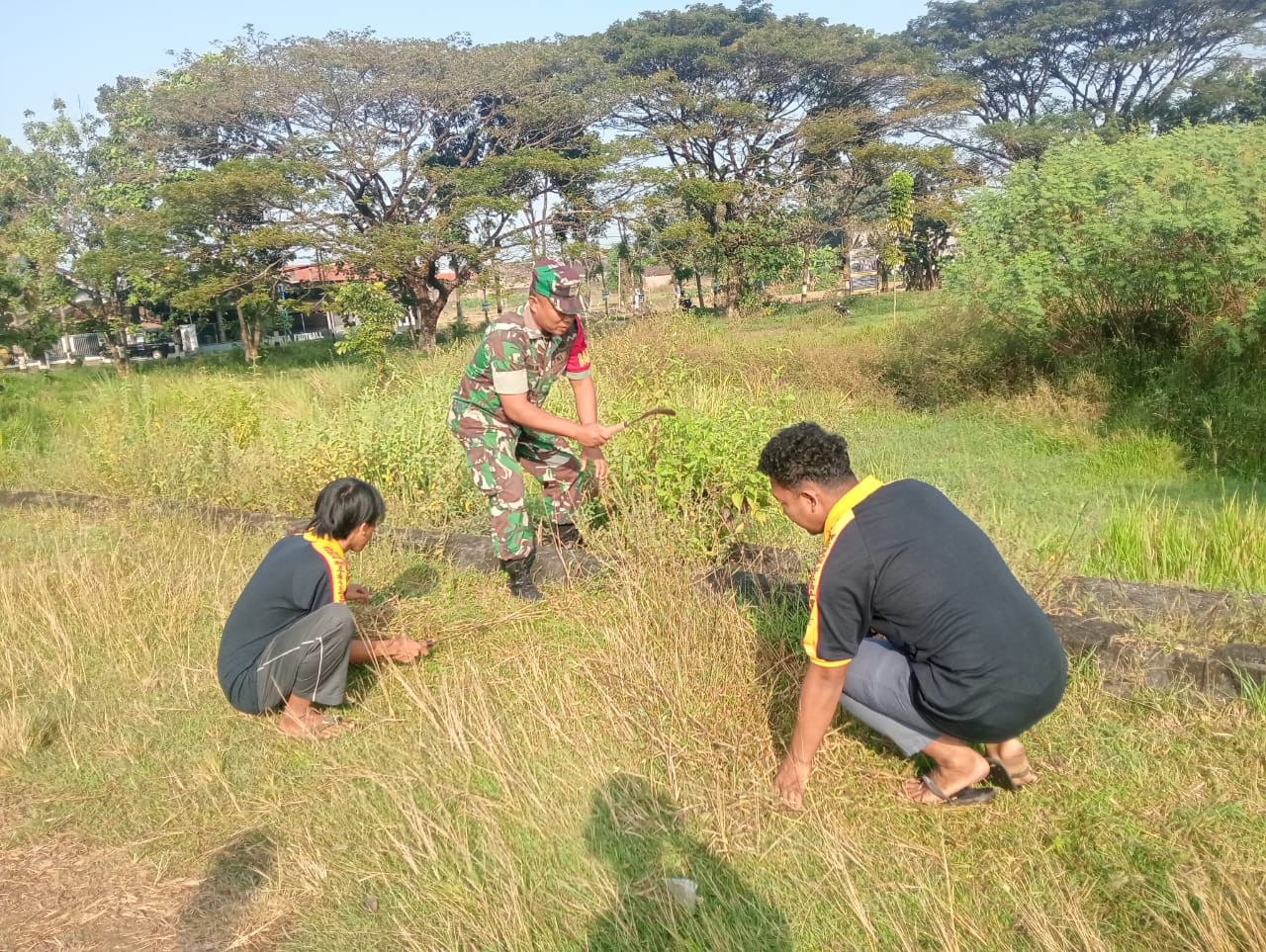 Kegiatan yang dimulai sejak pagi hari ini melibatkan sejumlah anggota Babinsa yang dengan semangat membersihkan dan merapikan rumput yang tumbuh liar di sekitar lapangan. Dengan menggunakan alat-alat sederhana seperti sabit, parang, dan mesin pemotong rumput, mereka bahu-membahu merapikan setiap sudut lapangan.