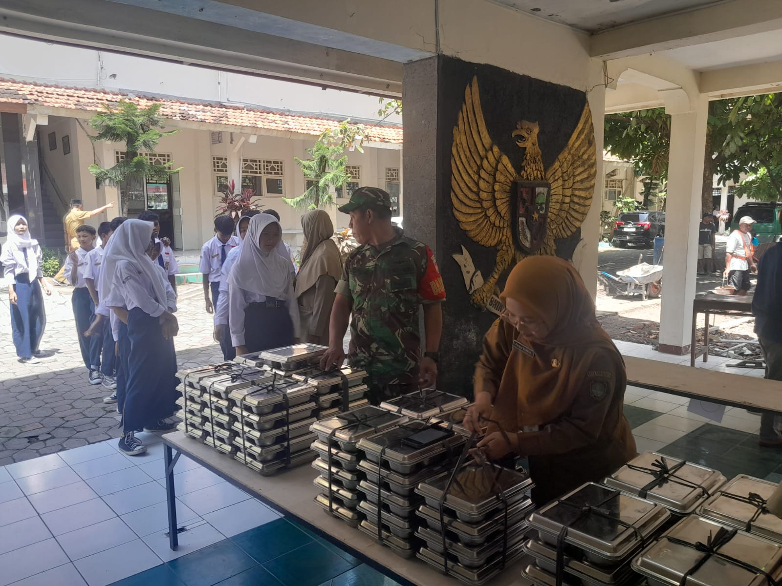 Matalensa- Surakarta, Babinsa Joyotakan Koramil 03/Serengan Kodim 0735/Surakarta Serka Sudiyono melaksanakan Pendampingan pendistribusian Makan Bergizi Gratis (MBG) di SMP Islam Bakti Jl. Wahid Hasim Rt 03 Rw 01 Joyotakan Serengan Kota Surakarta, Kamis Pukul 10.00 Wib (27/11/2025)