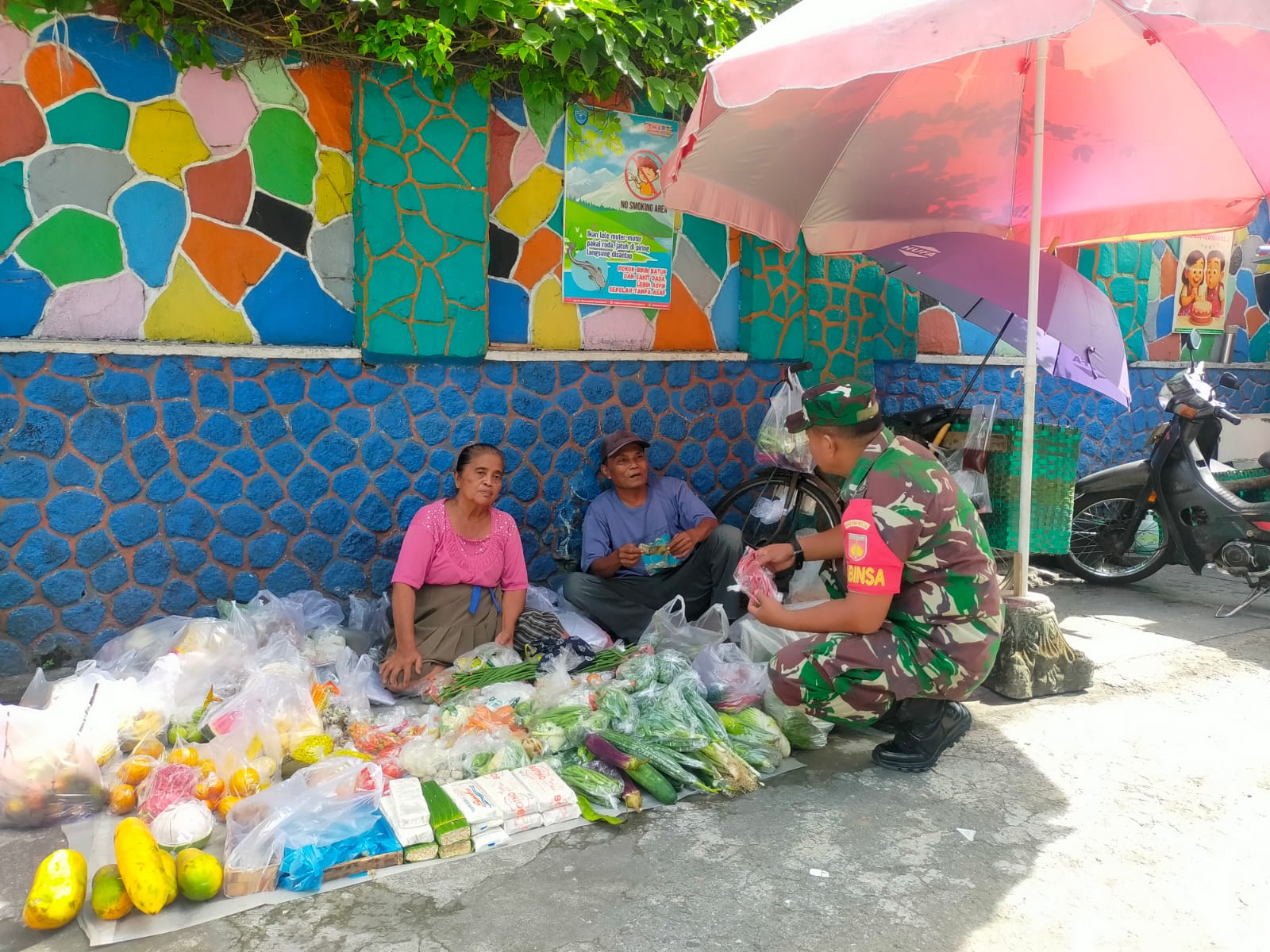 Dalam kunjungannya, Sertu Sugeng berinteraksi langsung dengan ibu Sriyanti, salah satu penjual sayuran keliling, dan membahas perkembangan usaha serta tantangan yang dihadapi.