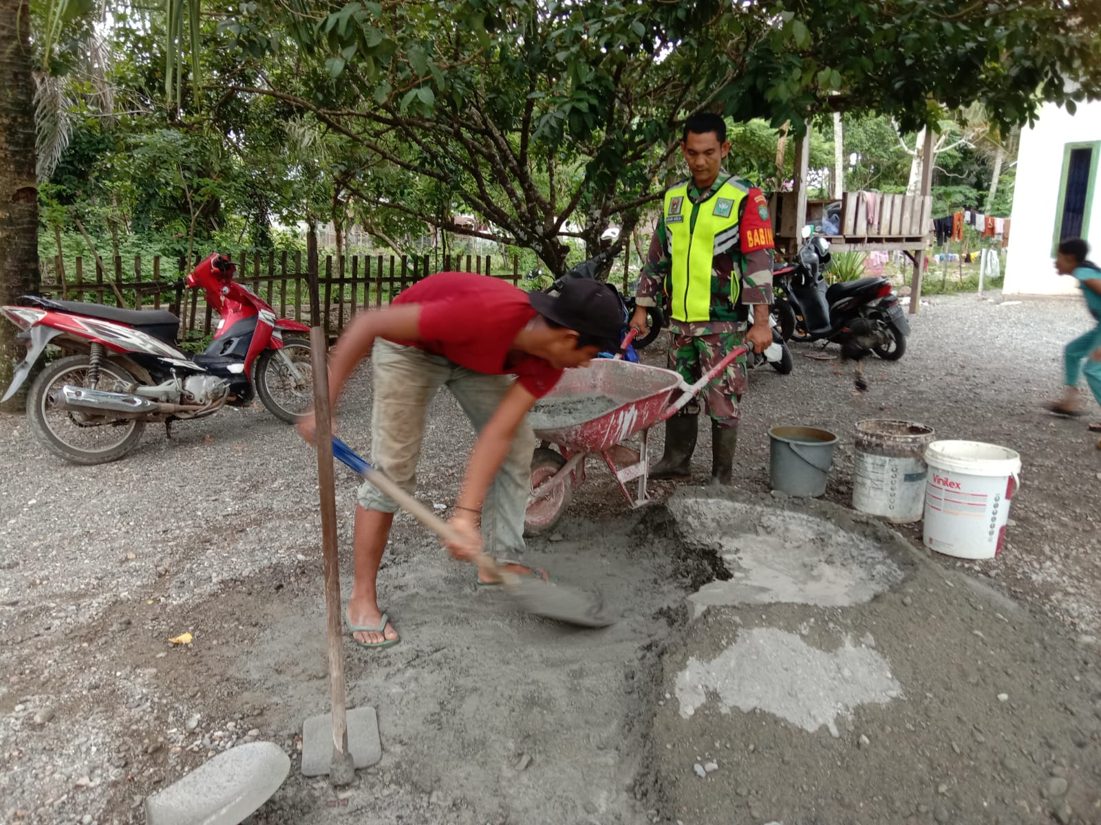 Dengan mengenakan rompi Babinsa, Sertu Buchari Muslim tampak terlibat langsung dalam pekerjaan fisik tersebut, mulai dari mencampur bahan material hingga membantu proses pengecoran. Kehadirannya bukan hanya memberikan tenaga tambahan, namun juga semangat kebersamaan yang mempererat hubungan antara TNI dan masyarakat.