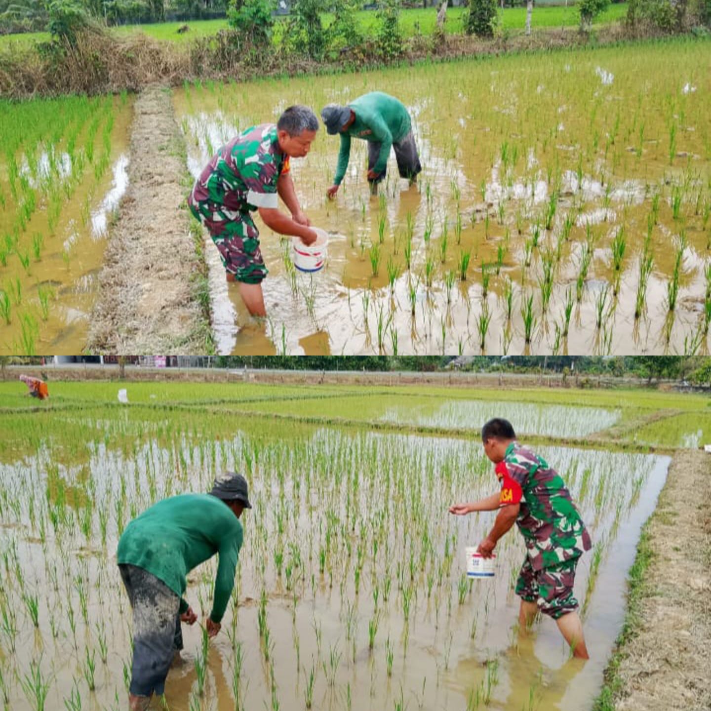 Kegiatan ini berlangsung di tengah hamparan sawah yang tergenang air, tempat di mana padi muda mulai tumbuh dengan rapi. Sertu Heru yang mengenakan seragam loreng dengan lengan bertuliskan “BABINSA”, tampak menyatu dengan suasana pertanian. Ia membawa wadah berisi pupuk dan dengan penuh semangat menaburkannya secara merata di antara barisan tanaman padi, mendampingi Bapak Zulfikar yang tengah menata tanaman .