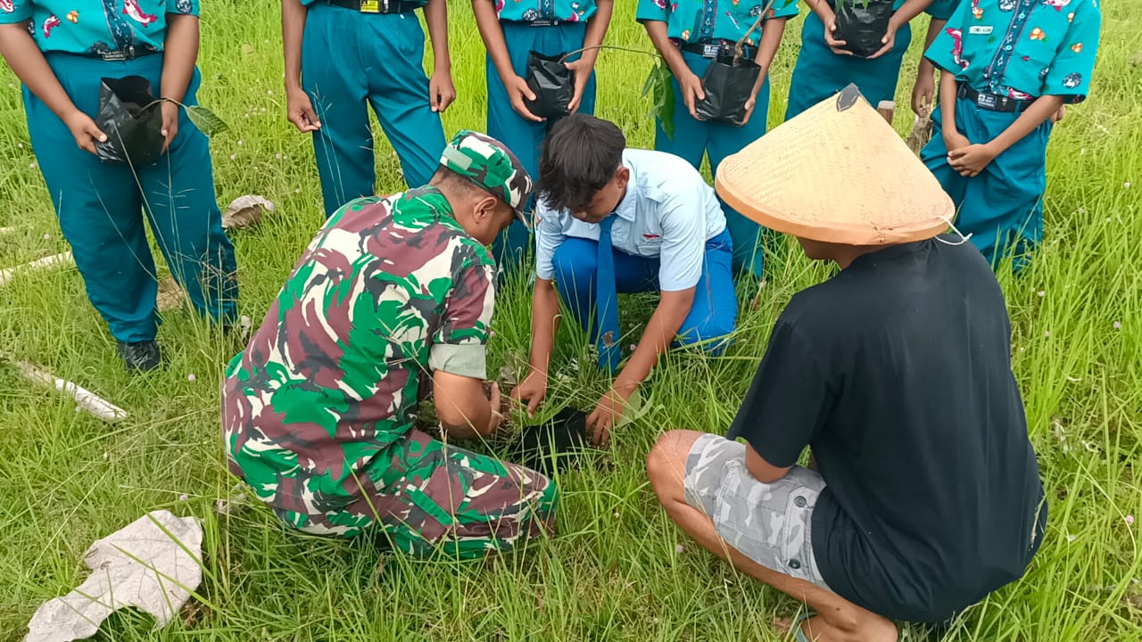 Matalensa || Blitar – Babinsa Desa Ngeni Subramil Wonotirto Koramil 0808/09 Sutojayan Serda Aga Panoto bersama para siswa SMPN 2 Wonotirto Desa Ngeni melaksanakan kegiatan penanaman pohon trembesi, Selasa (6/1/2026). Kegiatan ini merupakan bagian dari upaya mendukung program Manunggal Alam yang bertujuan menjaga kelestarian lingkungan sejak dini.