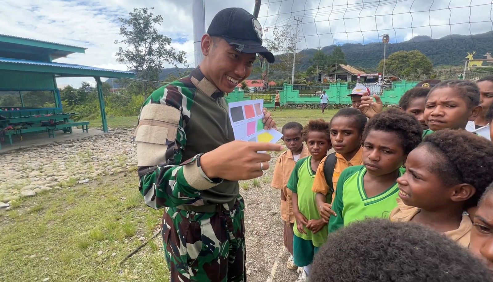 Tidak hanya itu, personel Pos Kotis juga mengajarkan beberapa gerakan yel-yel untuk membangkitkan semangat dan kekompakan. Suasana kegiatan berlangsung meriah, penuh tawa, dan membuat anak-anak antusias mengikuti setiap arahan prajurit.