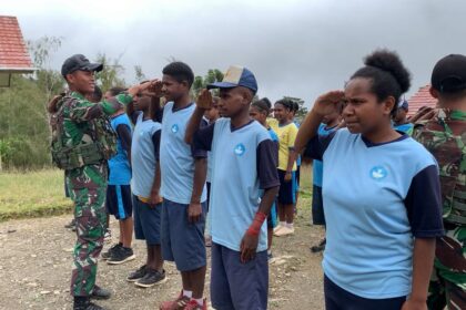 Matalensa- Bulangkop, Pegunungan Bintang-Pos Bulangkop Satgas Pamtas RI–PNG Yonif 751/Vira Jaya Sakti (VJS) melaksanakan kegiatan pembinaan teritorial dengan mengajarkan Peraturan Baris Berbaris (PBB)...