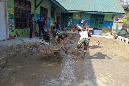 Matalensa- Lhoksukon – Anggota Koramil 08/Lhoksukon bersama personel Pemadam Kebakaran Kabupaten Aceh Utara melaksanakan kegiatan pembersihan di TK Kartika XIV-18 yang terdampak banjir, Senin (8/12/20...