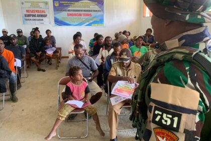 Matalensa—Kampung Tulo, Pegunungan Bintang — Pos Komando Taktis (Kotis) Yonif 751/Vira Jaya Sakti (VJS) menyelenggarakan Penyuluhan Kesadaran Bela Negara bagi warga Kampung Tulo. Kegiatan ini be...