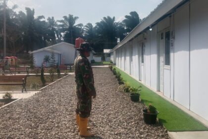 Matalensa- Aceh Utara – Anggota Koramil 29/Langkahan melaksanakan pendampingan lanjutan pembuatan hunian sementara (Huntara) oleh PT Waskita Karya dan PT PP di Desa Tanjoeng Dalam Selatan, wilay...