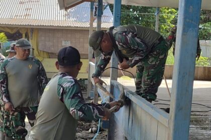 Matalensa- Aceh Utara – Personel Koramil 03/Dwt yang dipimpin oleh Pelda Rizal Fahlefi bersama pihak sekolah dan para siswa melaksanakan karya bhakti pembersihan SMP Nuzumush Shagira di Desa Lan...