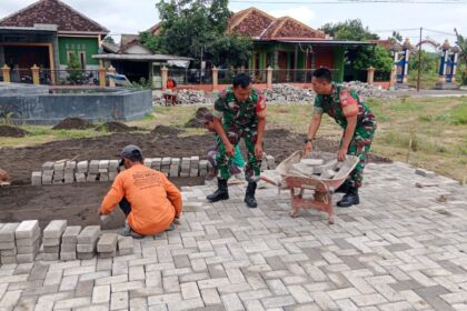Matalensa || Sragen, Dalam rangka meningkatkan sarana dan prasarana desa, Babinsa Desa Tanggan Koramil 12/Gesi Kodim 0725/Sragen Serda Ali Sumanto turut serta melaksanakan kerja bakti pemasangan pavin...