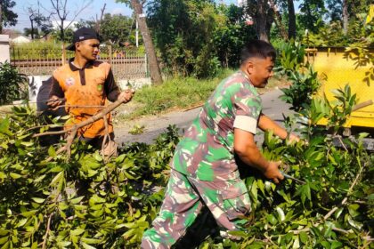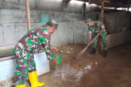 Matalensa- Aceh Utara – Anggota Koramil 05/Stb bersama para santri dan pengasuh Dayah Tahzibuddin melaksanakan karya bakti pembersihan lingkungan pendidikan di Desa Blang Bayu, Kecamatan Syamtal...
