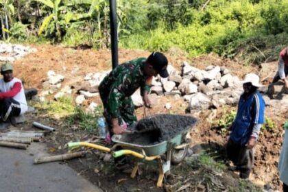 Matalensa || Boyolali. Membangun infrasruktur di desa, Babinsa Koramil 13/Nogosari Kodim 0724/Boyolali Serda Supriyadi bersama warga melaksanakan karya bakti bersama pembangunan talud jalan sebagai pe...
