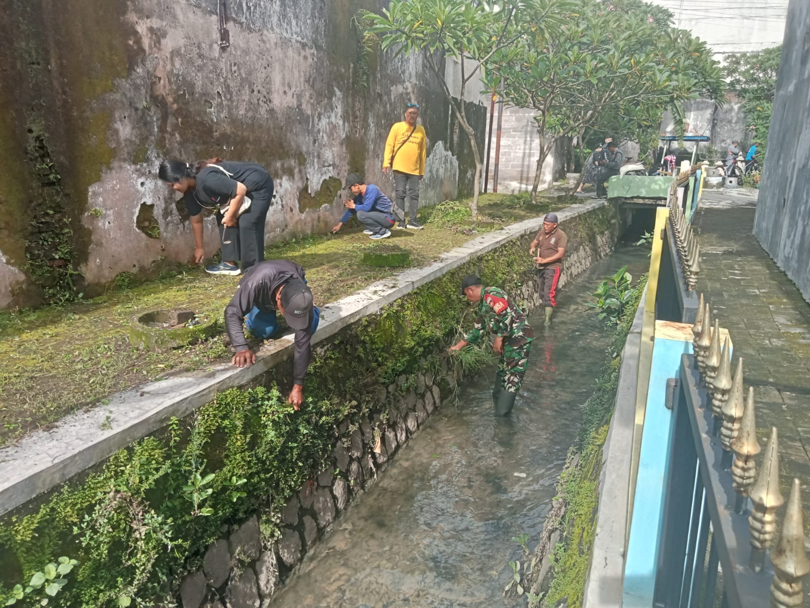 Matalensa- Surakarta – Bertempat saluran air RT.3 RW.8 Kelurahan Purwosari Kecamatan Laweyan, Babinsa Kelurahan Purwosari Koramil 01 Laweyan Kodim Surakarta Serka Murdianto bersama dengan Linmas dan warga masyarakat melaksanakan kerja bakti membersihkan rumput liar yang di saluran air.