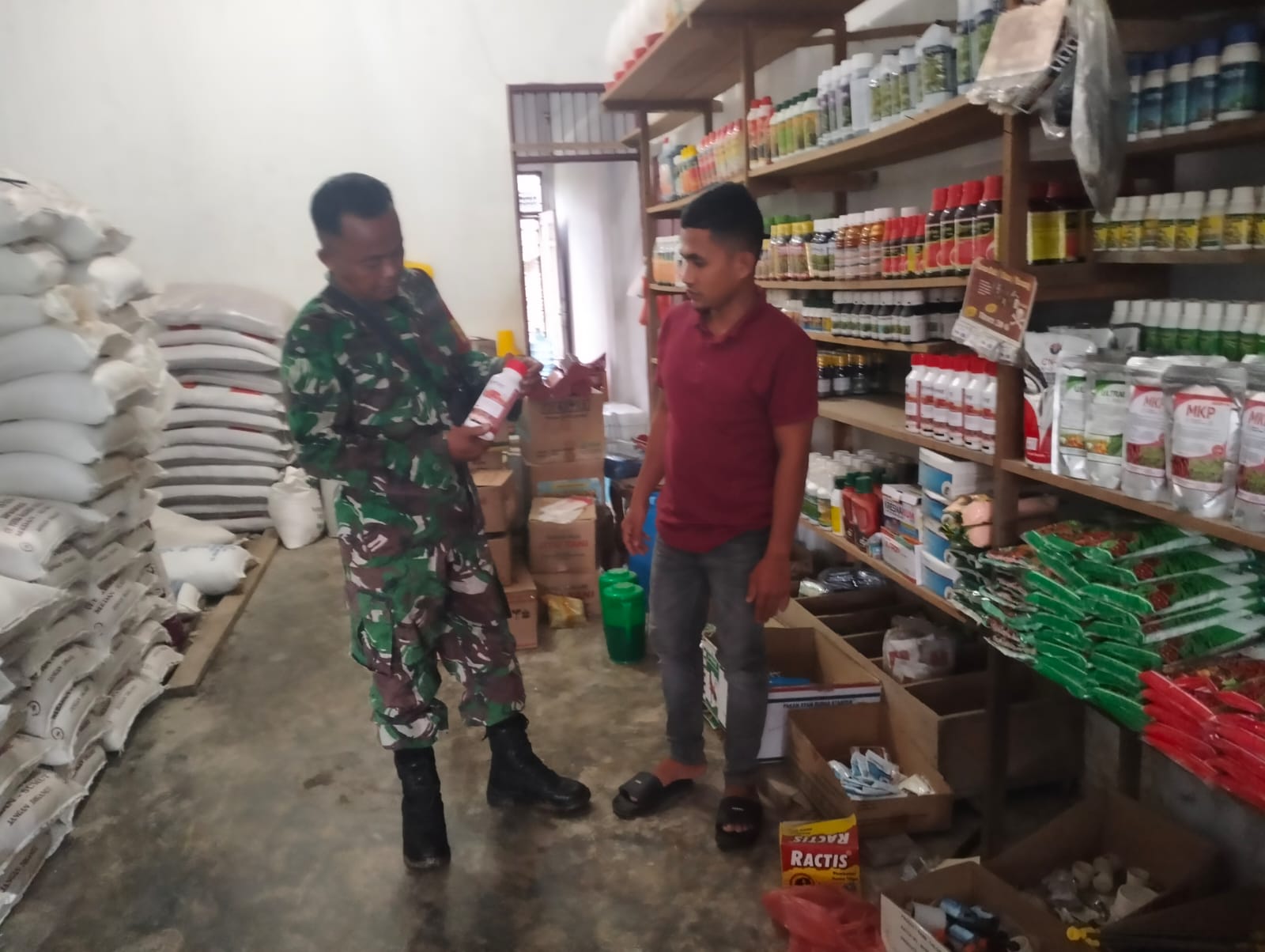 Dengan menyusuri kios-kios pupuk hingga berdialog santai bersama petani, Babinsa menggali informasi secara langsung terkait stok dan distribusi pupuk di lapangan. Pendekatan ini dilakukan agar kondisi nyata di wilayah binaan dapat terpantau secara akurat.