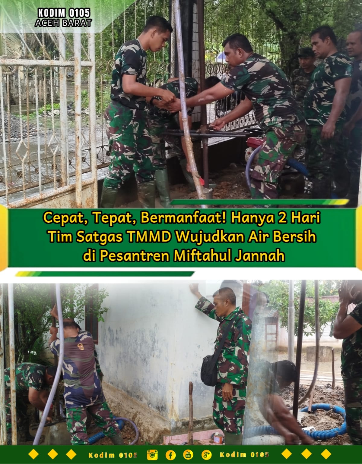 Matalensa|| Aceh Barat – Gerak cepat tanpa tunda, tim Satgas TMMD Reguler ke-127 Kodim 0105/Abar bersama masyarakat sukses mewujudkan air bersih di Pesantren Miftahul Jannah yang berlokasi di Desa Lueng Jawa, Kecamatan Woyla, Senin (23/2/2026).