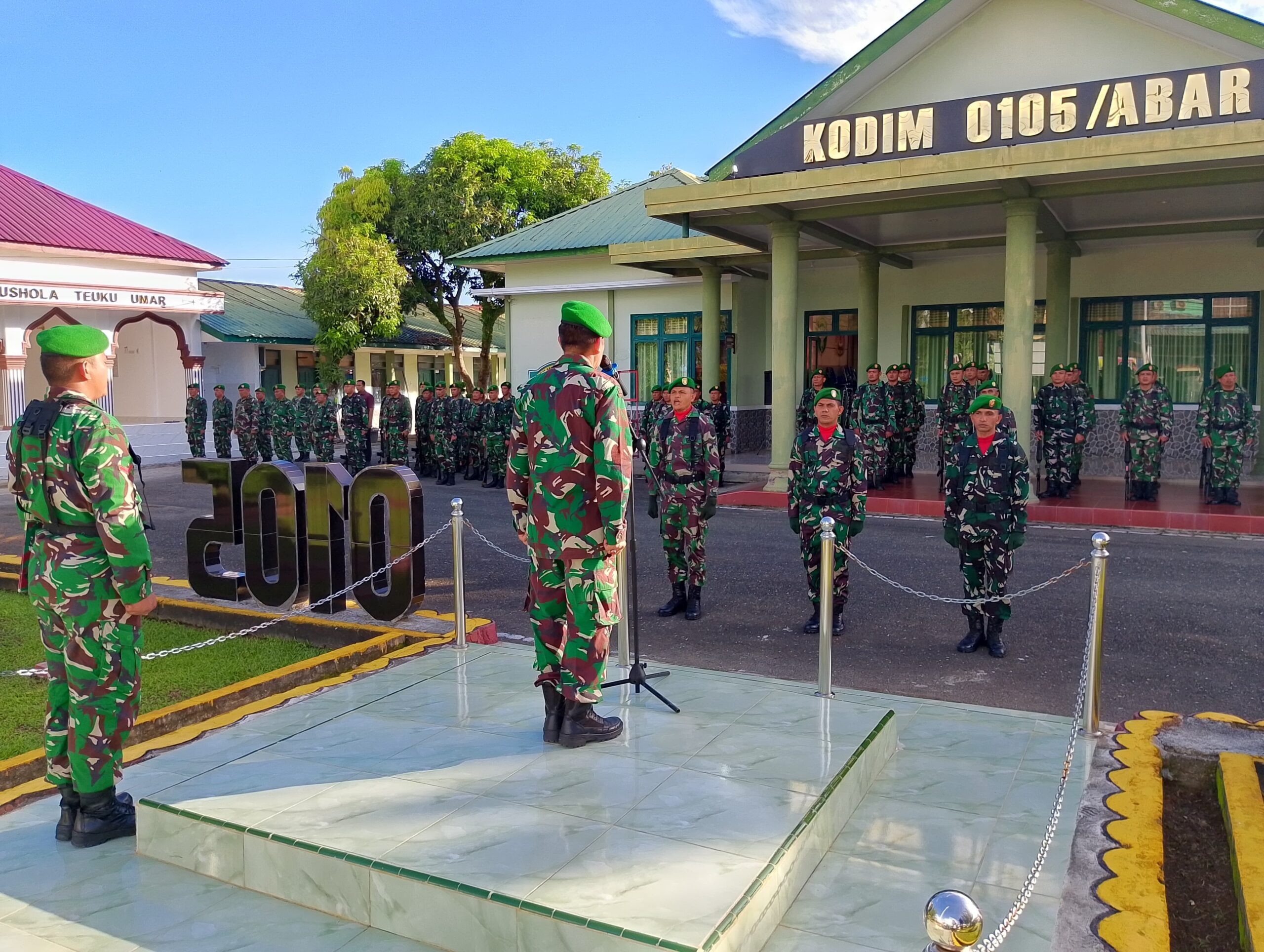 Bertindak sebagai Inspektur Upacara (Irup) Dandim 0105/Abar Letkol Inf S. Kembaren, S.E., M.I.P., CFrA., yang diwakili oleh Kasdim Mayor Cke Teguh Widodo. Upacara berlangsung tertib dan penuh semangat, mencerminkan jiwa nasionalisme serta kedisiplinan Prajurit dalam menghormati Sang Merah Putih.