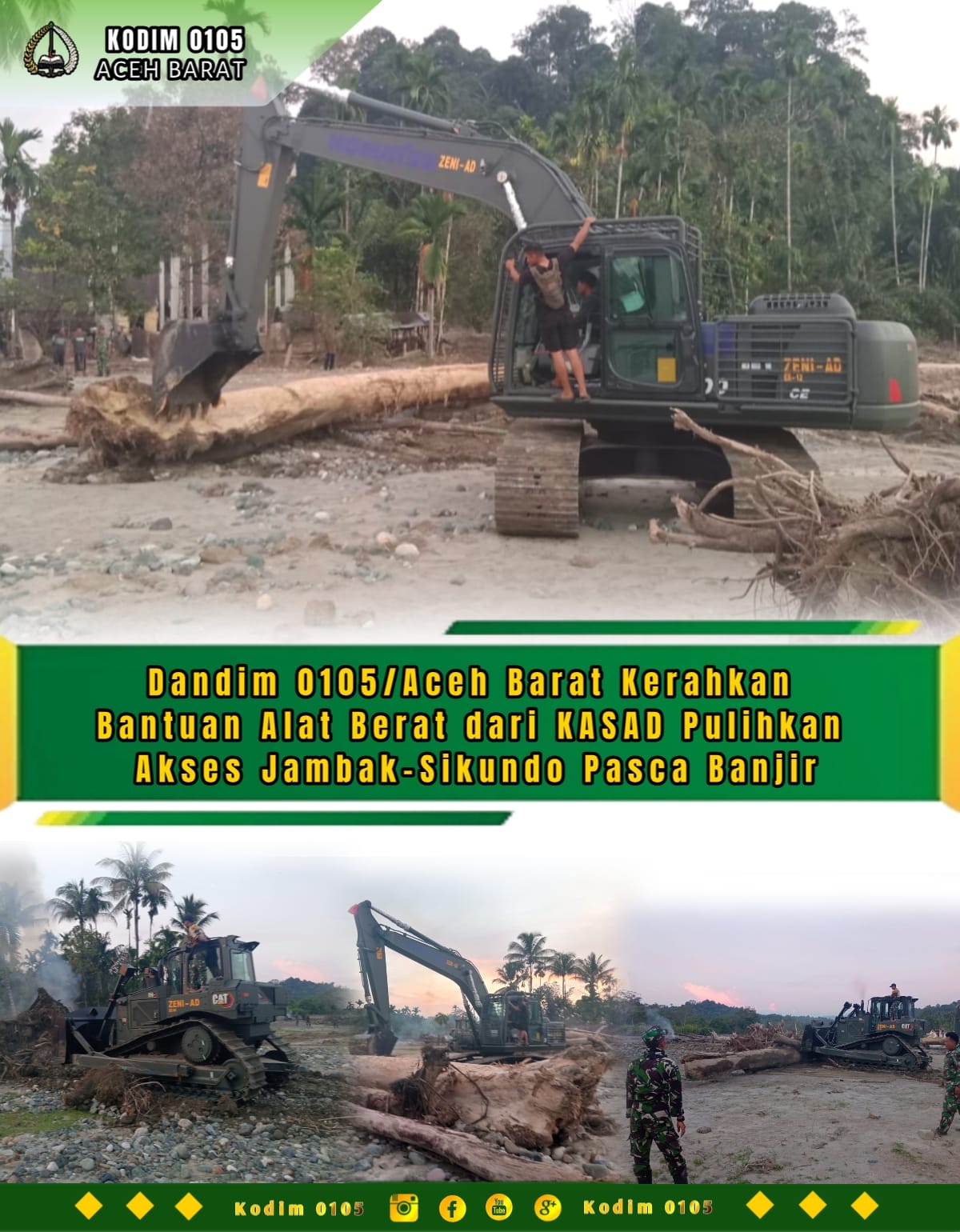 Matalensa|| Aceh Barat – Dandim 0105/Aceh Barat, Letkol Inf S Kembaren,S.E.,M.I.P.,CFrA., memerintahkan pengerahan alat berat untuk bekerja tanpa henti, guna mempercepat pembukaan kembali jalan penghubung Desa Jambak–Sikundo di Kecamatan Pante Ceureumen, Kabupaten Aceh Barat. Upaya ini dilakukan sebagai langkah darurat pasca bencana banjir yang merusak dan memutus akses utama warga, Minggu (18/1/2026).