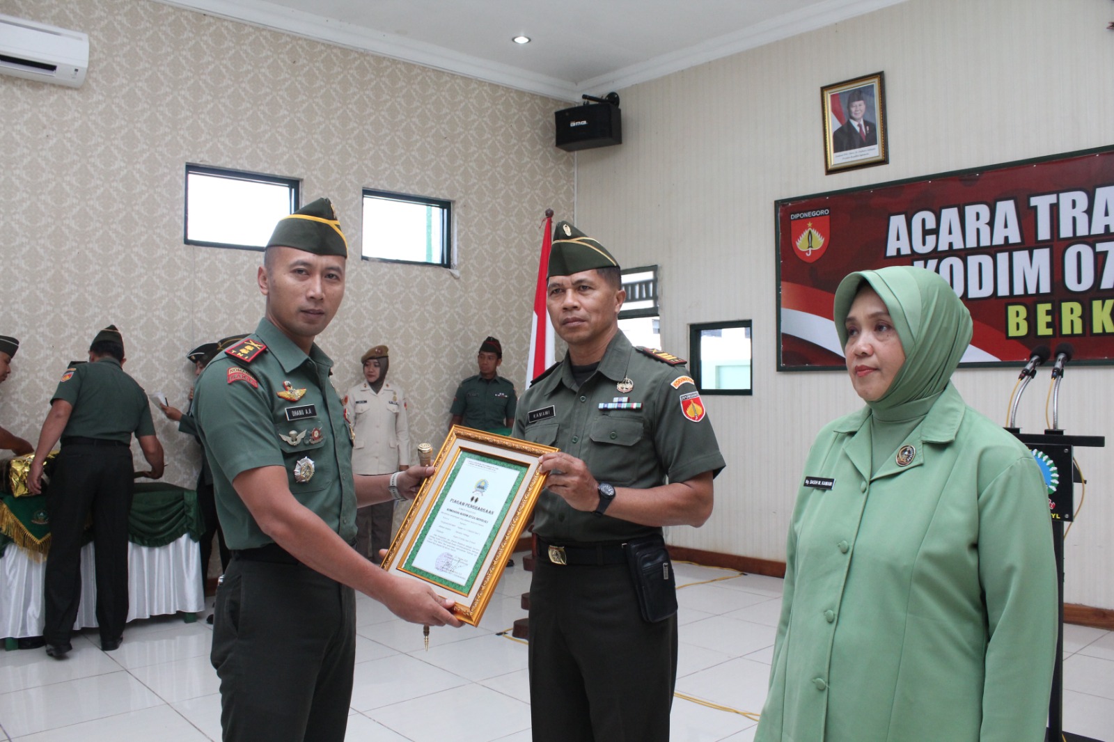 Matalensa- Boyolali. Suasana haru namun penuh kebanggaan menyelimuti Aula Makodim 0724/Boyolali saat Komandan Kodim 0724/Boyolali Letkol Inf Dhanu Anggoro Asmoro, S.E. memimpin acara korps raport pindah satuan bagi salah satu Perwira terbaiknya, Kapten Inf Kamami, Senin (27/10/25).