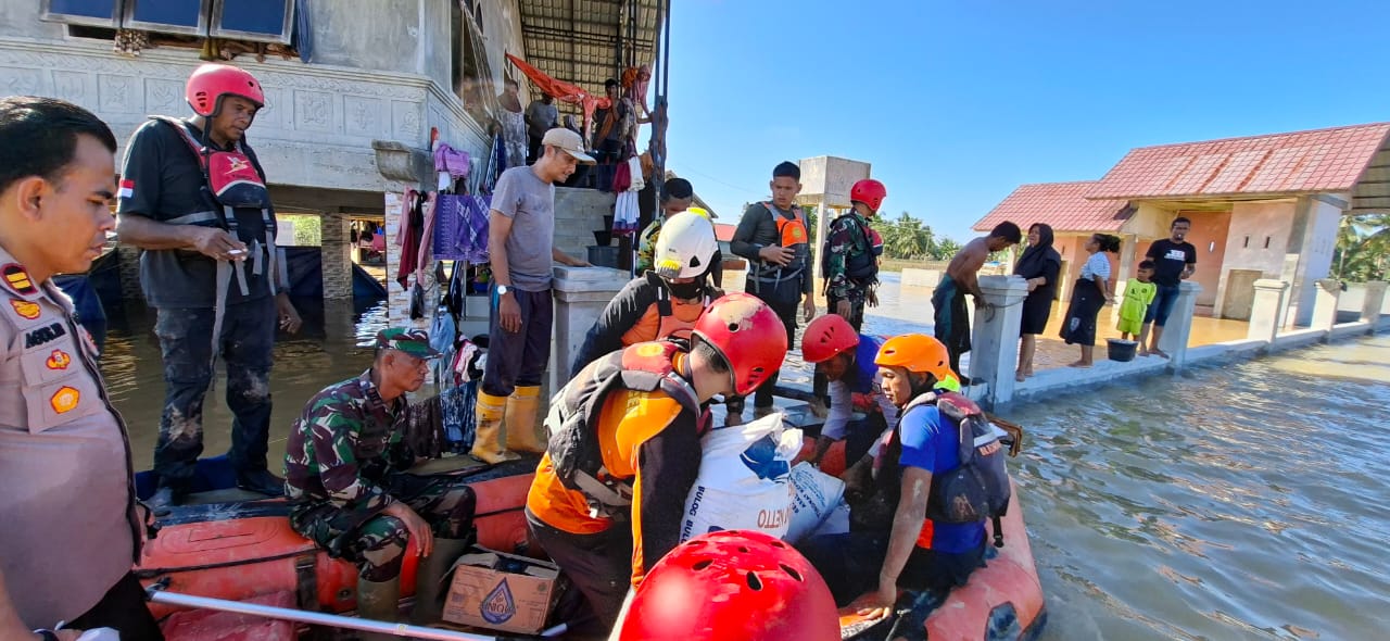 Untuk menjangkau lokasi tersebut, rombongan menggunakan LCR (Landing Craft Rubber) karena kondisi banjir cukup dalam dan arus kuat, sehingga perahu biasa tidak memungkinkan digunakan. Dengan penuh kewaspadaan, tim bergerak menerobos banjir menuju permukiman warga yang sudah beberapa hari tidak menerima pasokan kebutuhan pokok.