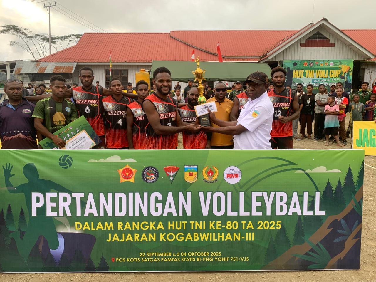 Matalensa—Pegunungan Bintang -Papua. Pertandingan puncak turnamen bola voli dalam rangka HUT TNI ke-80 berlangsung sengit dan penuh sensasi. Antas Putra keluar sebagai juara setelah menundukkan Okykawa Kaps Putra pada laga final yang diwarnai kejar-kejaran poin hingga menit terakhir. (Sabtu, 04/10/2025)