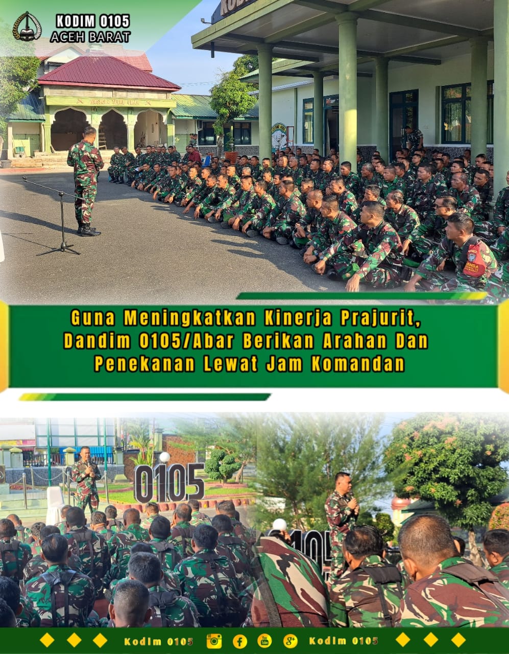 Matalensa || Aceh Barat – Guna meminimalisir pelanggaran dan meningkatkan kinerja Prajurit, Dandim 0105/Abar Letkol Inf S Kembaren,S.E.,M.I.P.,CFrA., memberikan penekanan dan arahan kepada seluruh anggota melalui Jam Komandan di halaman Makodim setempat Jalan Imam Bonjol Desa Drien Rampak Kecamatan Johan Pahlawan, Senin (19/1/2026)