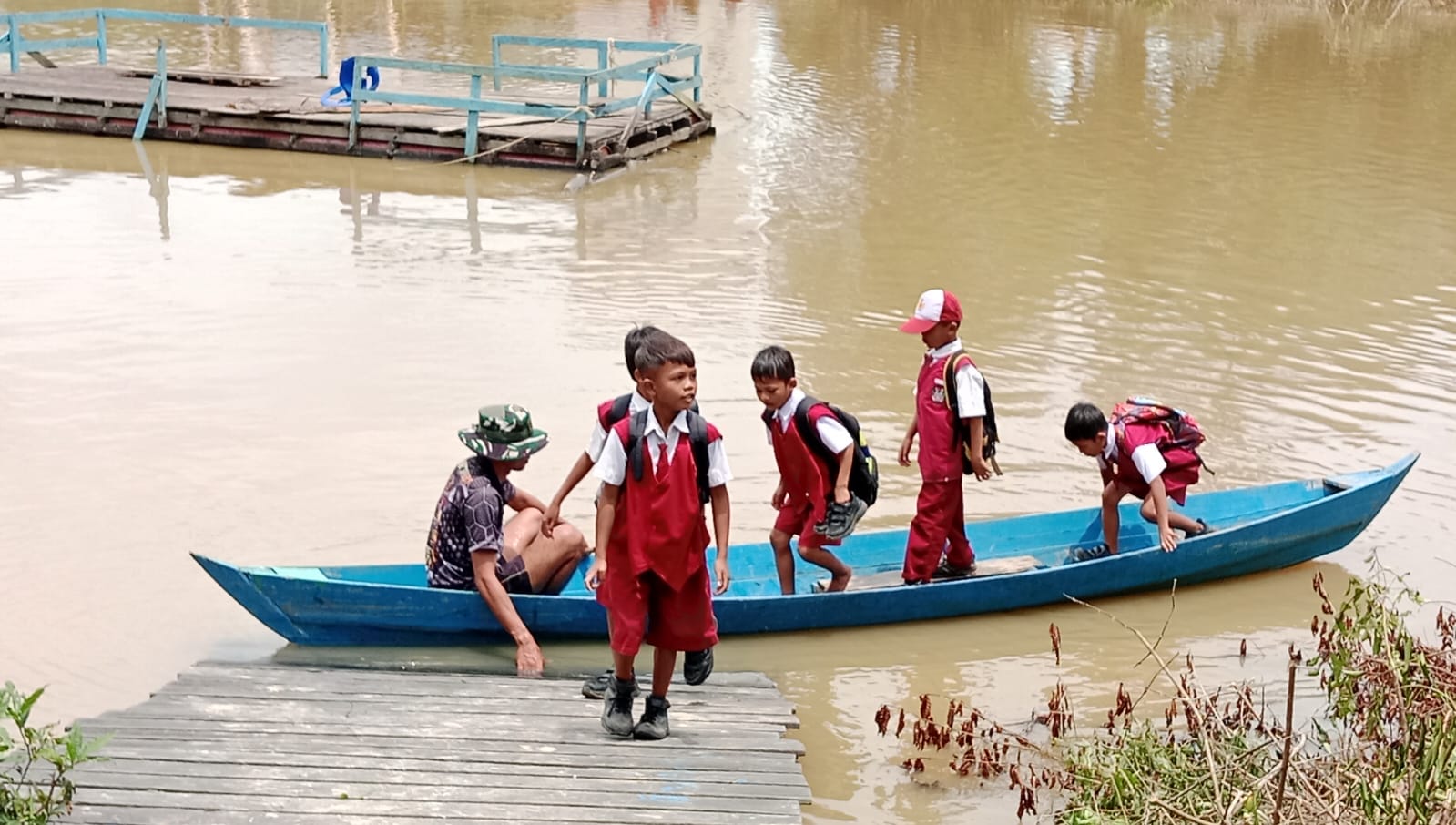 Disamping melaksanakan pembagunan jembatan Garuda Serka Herman juga menyempatkan waktu untuk membantu anak anak berangkat ataupun pulang sekolah menggunakan perahu.