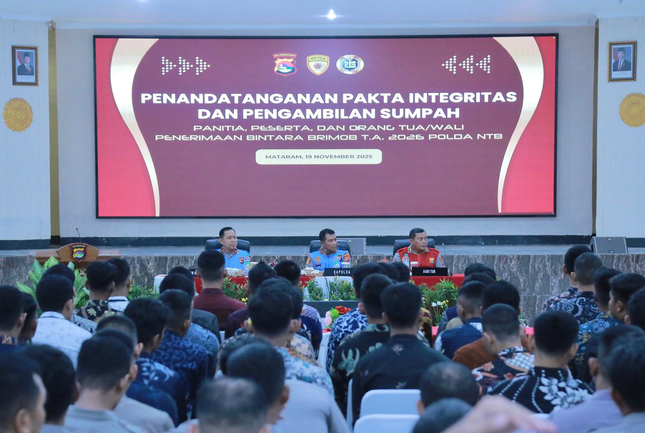 Matalensa- Mataram, NTB – Kepala Kepolisian Daerah Nusa Tenggara Barat (Kapolda NTB) Irjen Pol. Hadi Gunawan, S.I.K., memimpin secara langsung kegiatan Penandatanganan Fakta Integritas dan Pengambilan Sumpah Panitia, Peserta, serta Orang Tua/Wali dalam proses seleksi Bintara Brimob Polri Tahun Anggaran 2026. Acara berlangsung khidmat di Gedung Sasana Dharma Polda NTB, Rabu (19/11/2025).