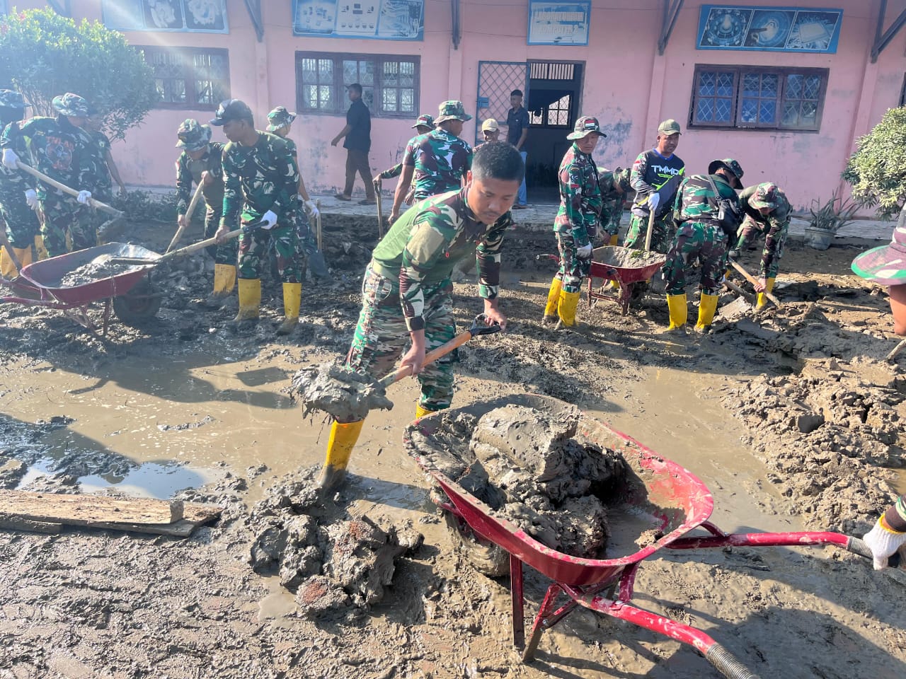 Karya bakti difokuskan pada pembersihan lumpur, sampah kayu, serta sisa material banjir yang menutupi halaman dan area bermain anak-anak. Berdasarkan pantauan di lapangan, personel TNI terlihat bekerja secara gotong royong menggunakan alat sederhana seperti sekop dan gerobak dorong untuk mengangkut material sisa banjir agar lingkungan sekolah kembali bersih dan aman.