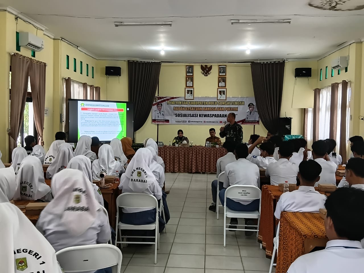Matalensa || BARABAI – Komitmen memperkuat nilai kebangsaan terus diperkuat di Kabupaten Hulu Sungai Tengah. Pasi Intel Kodim 1002/HST, Kapten Inf Lilis Susanto, menjadi narasumber dalam kegiatan sosialisasi bertema “Radikalisme dan Terorisme sebagai Ancaman Kebhinekaan” yang digelar oleh Badan Kesatuan Bangsa dan Politik (Kesbangpol) HST di Aula SMA Negeri I Hulu Sungai Tengah, Selasa (09/12/2015).