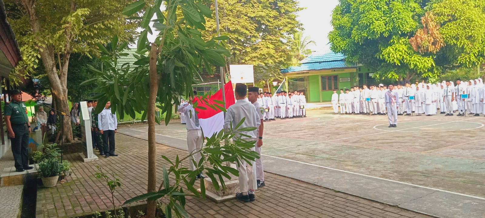 Matalensa–HULU SUNGAI TENGAH – Plh. Danramil 1002-04/Labuan Amas Selatan Peltu Adei Riyanto menjadi pembina upacara bendera merah putih di Madrasah Aliyah Negeri (MAN) 4 Hulu Sungai Tengah, Senin (20/10/2025).