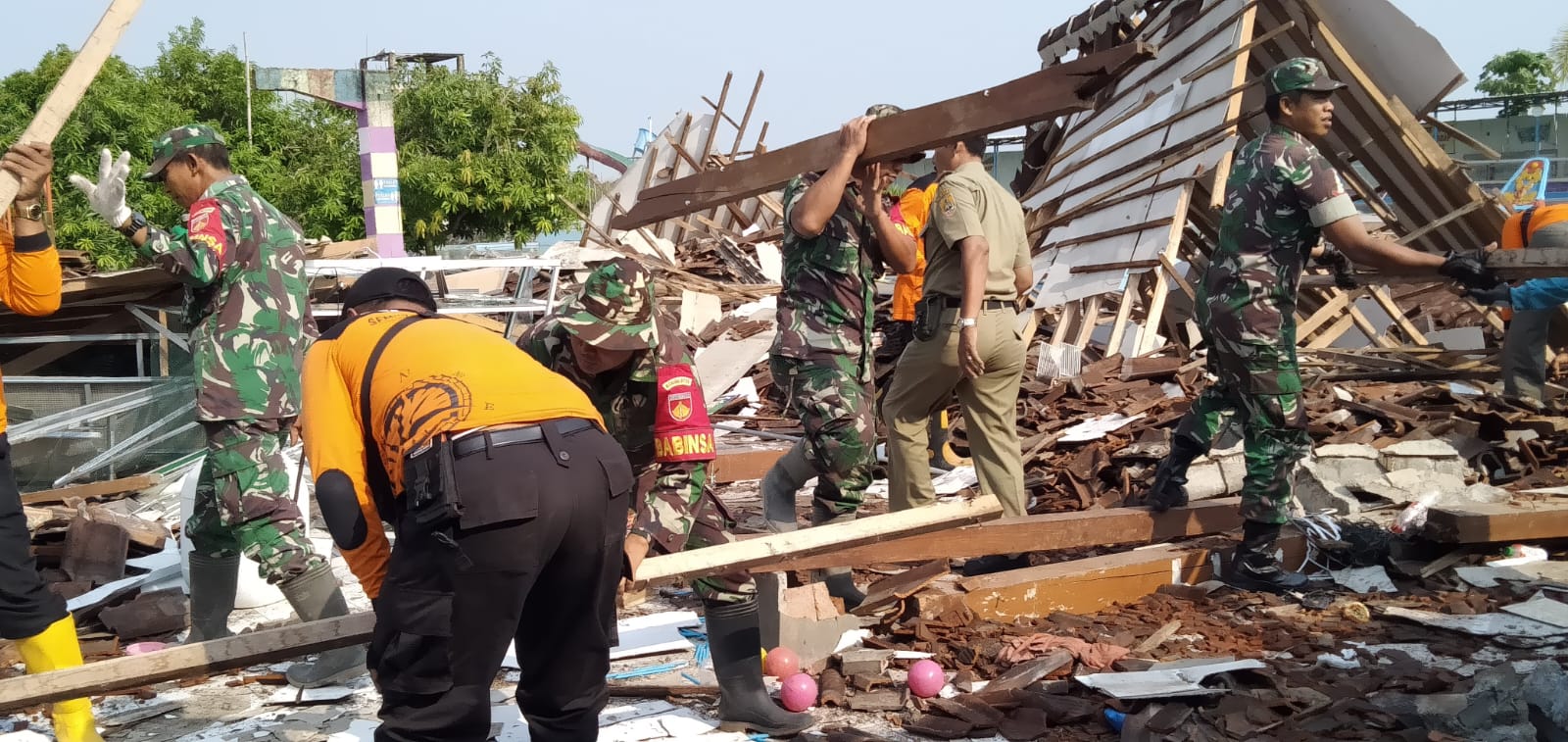Kegiatan yang dipimpin langsung oleh Serka Sumanto tersebut melibatkan personel TNI, perangkat desa, serta warga sekitar. Pembersihan difokuskan pada pengangkatan puing-puing bangunan serta sampah yang menumpuk di sekitar lokasi waterbom.