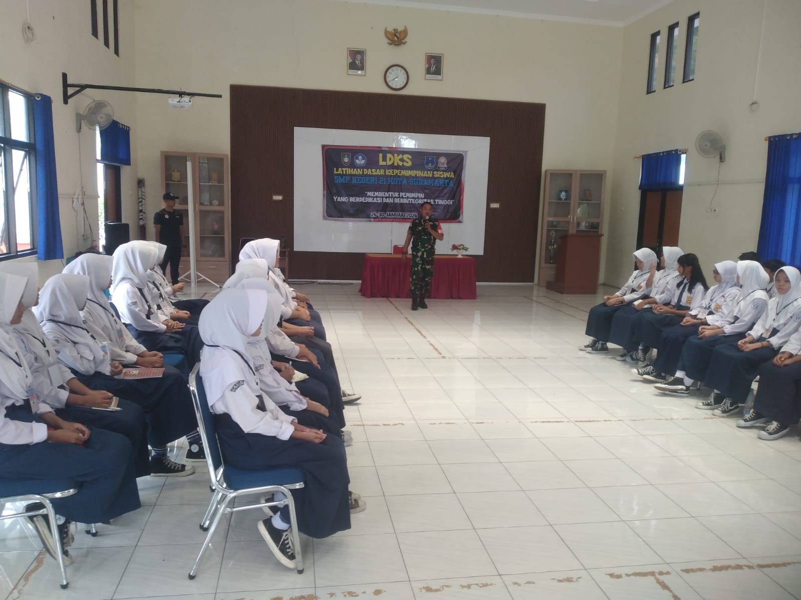 Matalensa- Surakarta – Dalam rangka menanamkan jiwa kepemimpinan dan kedisiplinan sejak dini, Babinsa Kelurahan Sewu Koramil 04/Jebres Kodim 0735/Surakarta Koptu Sanda Arieswanto melaksanakan kegiatan pemberian materi Latihan Dasar Kepemimpinan Siswa (LDKS) kepada siswa-siswi calon pengurus OSIS SMP Negeri 21 Surakarta periode tahun 2026.
