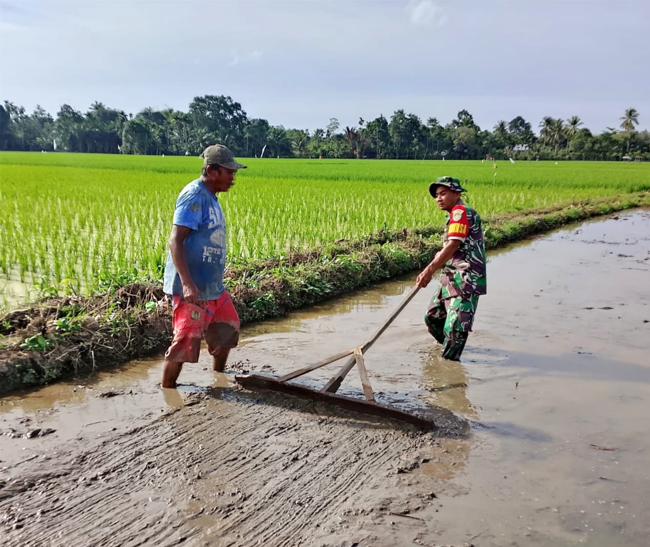 Tanpa ragu menyingsingkan lengan baju, Sertu Digdoyo ikut terjun ke tengah sawah yang masih dipenuhi lumpur sisa banjir. Kehadirannya menjadi bukti nyata bahwa TNI selalu hadir bersama rakyat, khususnya di saat masyarakat menghadapi kesulitan akibat bencana alam.