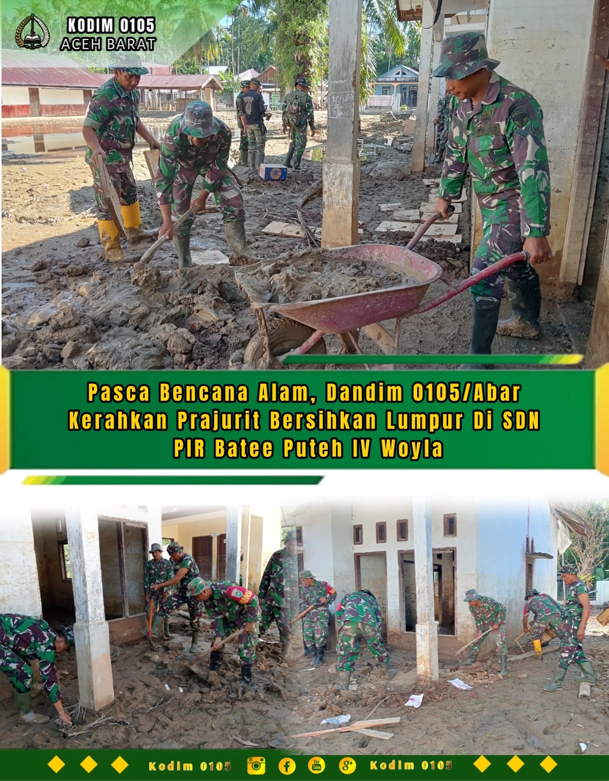 Matalensa || Aceh Barat – Setelah wilayah Aceh Barat dilanda bencana alam beberapa waktu lalu, Komandan Kodim 0105/Aceh Barat Letkol Inf S Kembaren,S.E.,M.I.P.,CFrA. langsung mengambil langkah cepat dengan menginstruksikan seluruh jajaran Prajurit untuk melaksanakan pembersihan fasilitas umum. Layaknya hari ini menggelar aksi kemanusiaan membersihkan lumpur di SDN PIR Batee Puteh IV Desa Pasi Birah Kecamatan Woyla Induk, Minggu (11/1/2026)