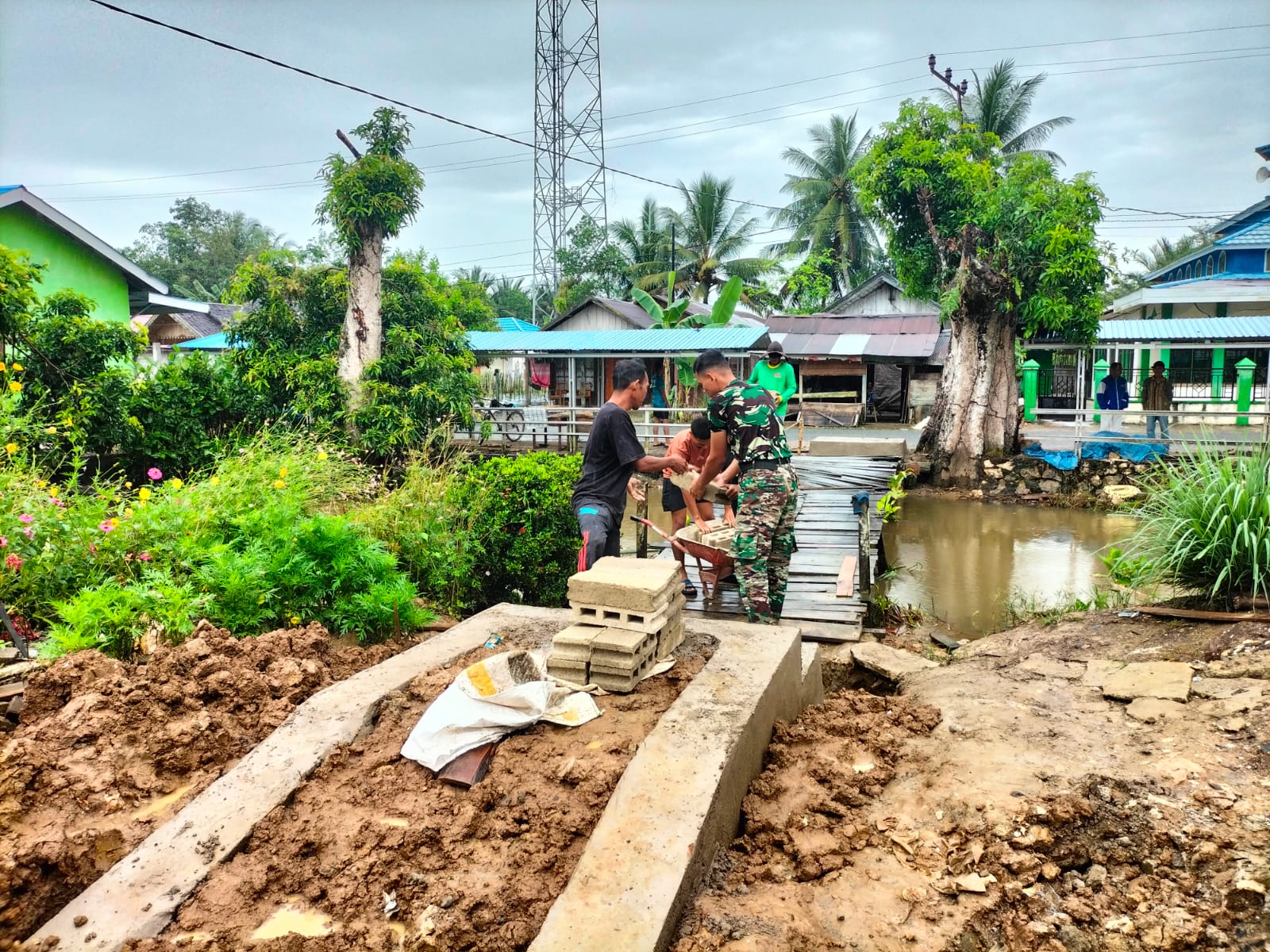 Di lapangan, terlihat anggota TNI bersama masyarakat bahu-membahu melakukan berbagai pekerjaan, mulai dari penataan material hingga persiapan konstruksi lanjutan.