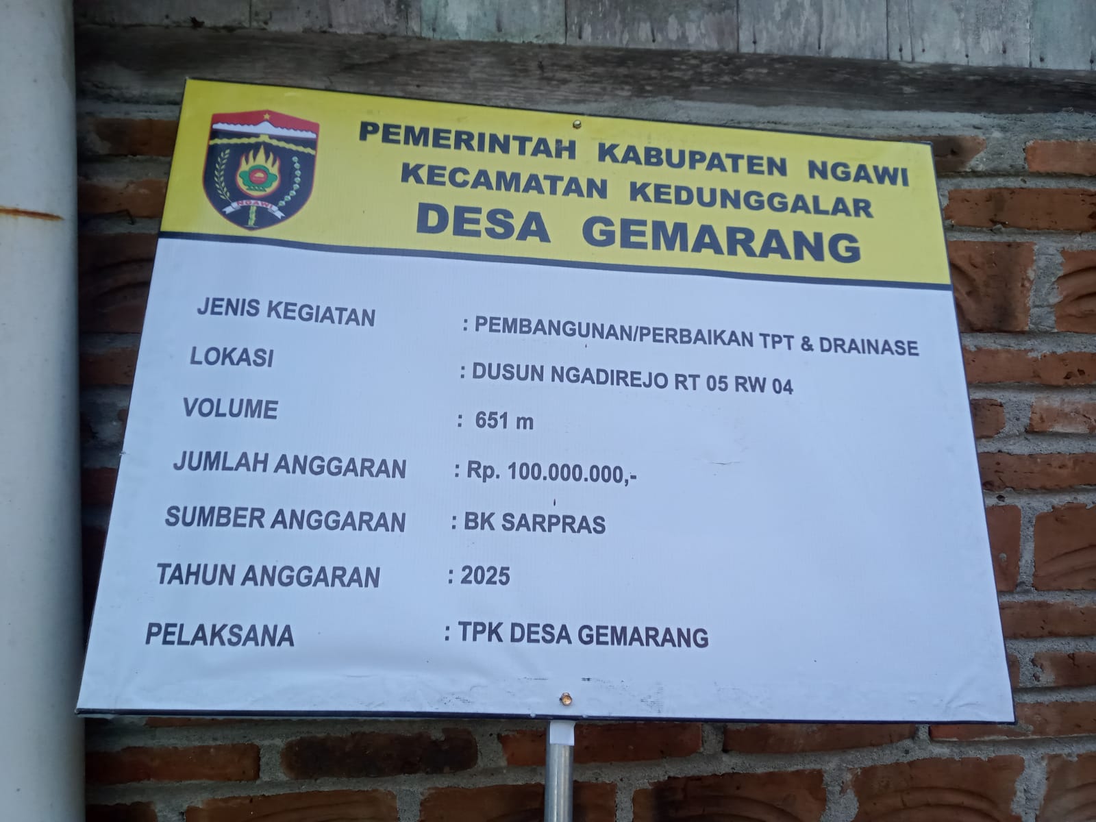 Matalensa|| Ngawi- Guna meningkatkan perekonomian warga, Pemerintah Desa Gemarang, Kecamatan Kedunggalar, Kabupaten Ngawi, Jawa Timur, terus berupaya meningkatkan pembangunan untuk memperbaiki perkuatan jalan dengan membangun talud/TPT (tempat penahan tanah) yang bersumber dari BK Sarpras Tahun 2025, Jum’at (5/13/2025).