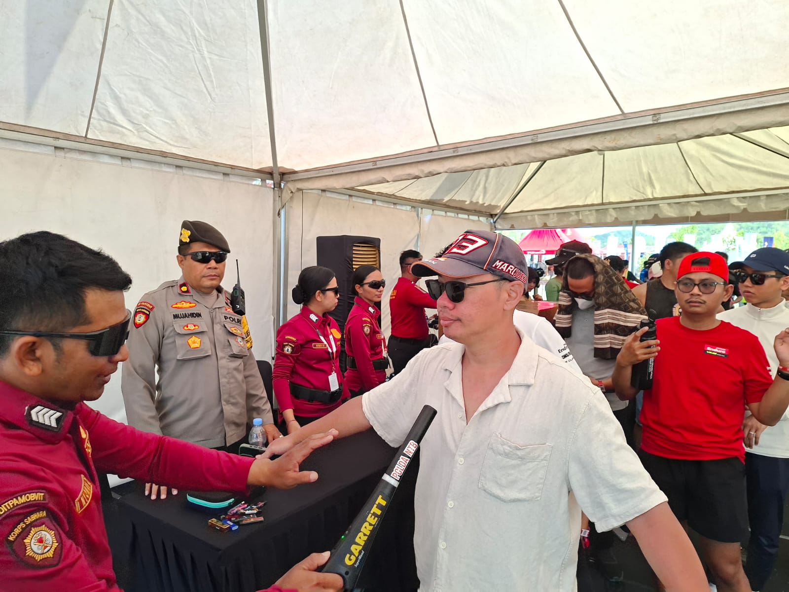 Kasatgas Humas Operasi Mandalika Rinjani 2025, Kombes Pol. Mohammad Kholid, SIK., menjelaskan bahwa pemeriksaan dilakukan menyeluruh terhadap setiap orang dan barang bawaan untuk memastikan situasi di dalam sirkuit tetap aman dan kondusif.