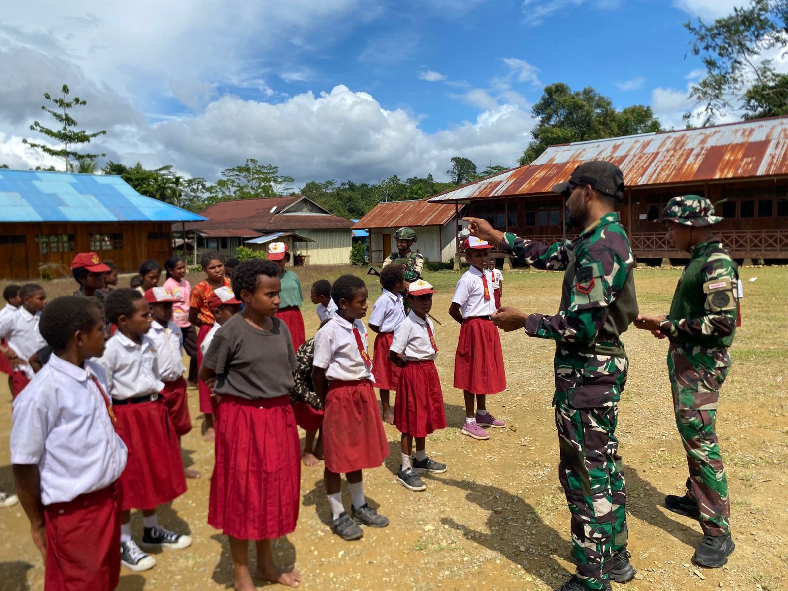 Matalensa || Iwur, Pegunungan Bintang – Pos Iwur Satgas Pamtas RI–PNG Yonif 751/Vira Jaya Sakti (VJS) menyelenggarakan kegiatan komunikasi sosial (Komsos) di SD Inpres Iwur dengan muatan materi lagu-lagu nasional dan Peraturan Baris-Berbaris (PBB). Kegiatan dipimpin Danpos Iwur, Lettu Inf Afrizal Sianipar, sebagai upaya menumbuhkan disiplin, kebersamaan, dan rasa cinta tanah air sejak dini di lingkungan sekolah.(Senin,1/12/2025).