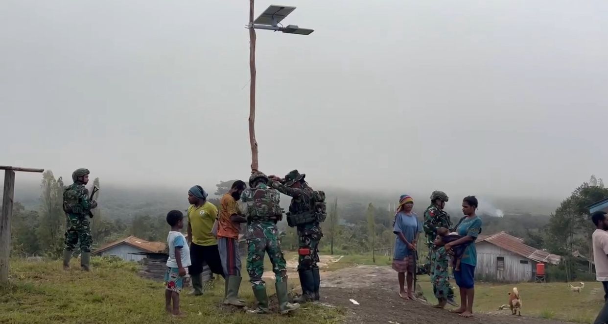 Matalensa—Pegunungan Bintang — Wujud nyata pengabdian TNI di perbatasan terus ditunjukkan oleh Satgas Yonif 751/Vira Jaya Sakti. Kali ini, Pos Serambakon kembali melaksanakan kegiatan kemanusiaan dengan memasang lampu tenaga surya di sejumlah titik pemukiman warga sekitar pos.