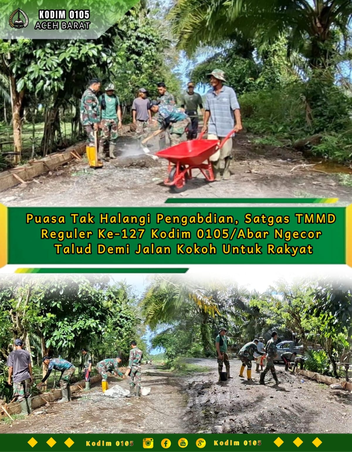 Matalensa || Aceh Barat – Semangat ibadah dan pengabdian menyatu dalam diri Personel Satgas TMMD Reguler Ke-127 Kodim 0105/Abar yang terus melanjutkan pekerjaan sasaran fisik pembuatan Talud Penahan Timbunan (TPT) di Desa Pasi Aceh, Kecamatan Woyla, Kamis (19/2/2026)