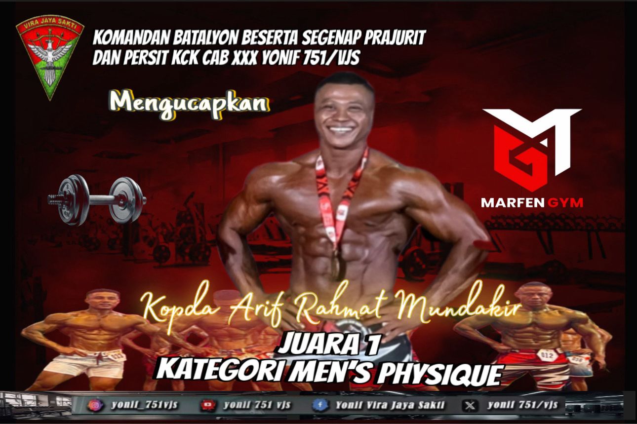 Matalensa—Timika, Papua Tengah — Batalyon Infanteri 751/Vira Jaya Sakti (Yonif 751/VJS) kembali mencetak prestasi membanggakan. Kali ini, datang dari cabang olahraga binaraga dan fitness melalui prajuritnya, Kopda Arif Rahmat Mundakir, yang berhasil meraih gelar juara 1 di ajang bergengsi Marten Gym Body Contest 2025 dalam kategori Men’s Physique.