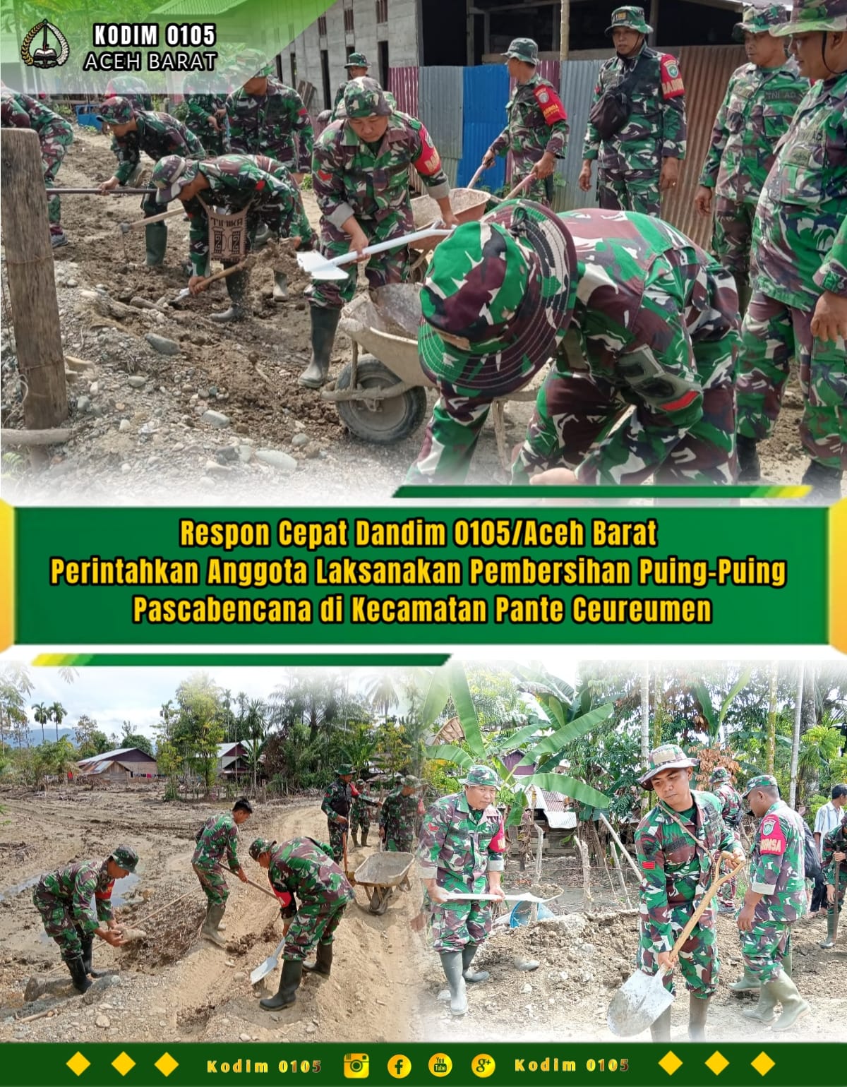 Dandim 0105/Aceh Barat, Letkol Inf S Kembaren.S.E.,M.I.P.,CFrA. dengan cepat dan tegas memerintahkan seluruh jajaran serta personel teritorial untuk segera turun ke lapangan melaksanakan pembersihan puing-puing pascabencana.