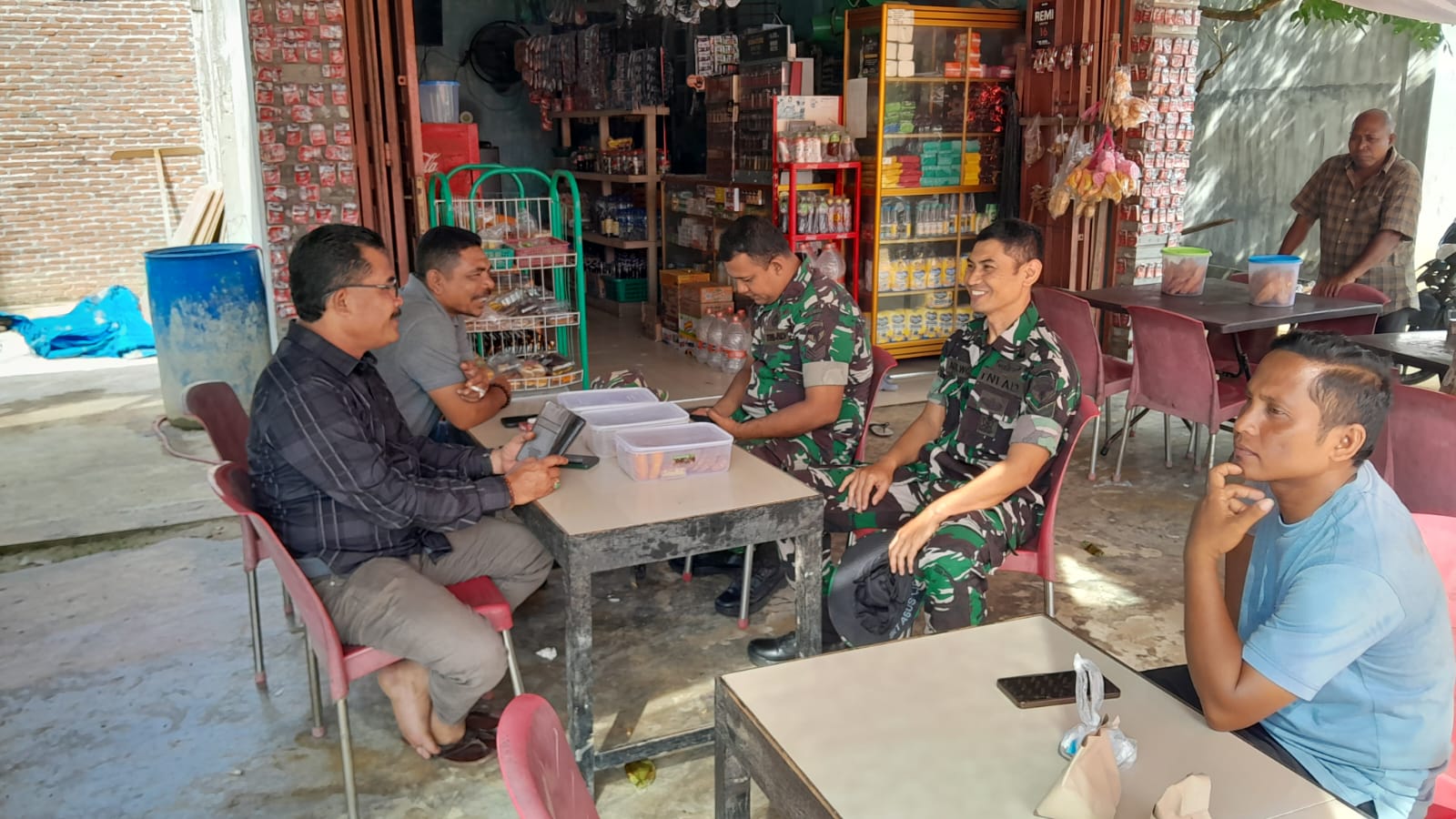 Dalam suasana santai di sebuah warung kopi, Sertu Agus Wiguna berbincang akrab dengan warga membahas berbagai hal seputar situasi keamanan dan ketertiban masyarakat (Kamtibmas) serta kondisi sosial di lingkungan sekitar.