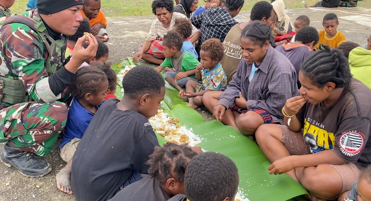 Momen kebersamaan semakin terasa saat makanan disajikan di atas daun pisang yang disusun memanjang, lalu dinikmati bersama-sama dengan duduk di bawah tanpa sekat dan tanpa perbedaan. Pemandangan tersebut menjadi simbol eratnya hubungan antara TNI dan rakyat, di mana prajurit hadir bukan hanya sebagai penjaga keamanan, tetapi juga sebagai bagian dari masyarakat itu sendiri.